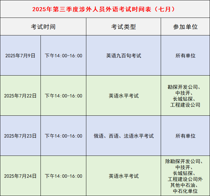 中石油涉外人员外语考试时间表(第三季度)